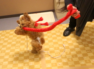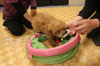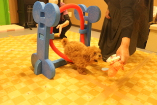 輪くぐりもおもちゃで誘導して練習しました